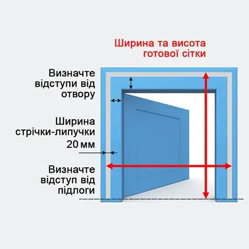 2. Прикладіть сітку до отвору так, щоб стулки зімкнулися. Зробіть розмітку по ширині та висоті. Сітка не повинна стелитись по підлозі, бути сильно натягнута по ширині, це заважатиме змиканню стулок;
