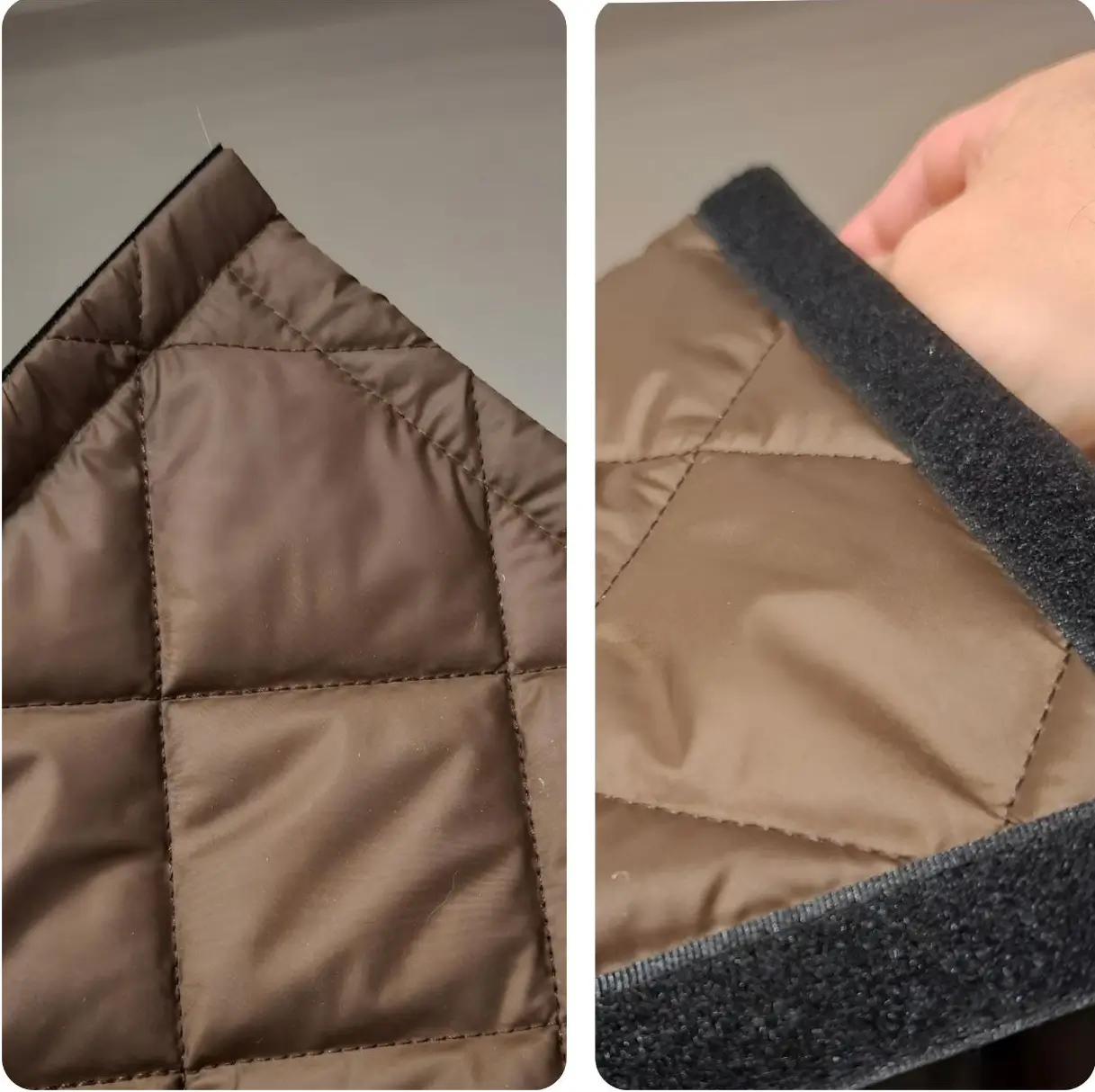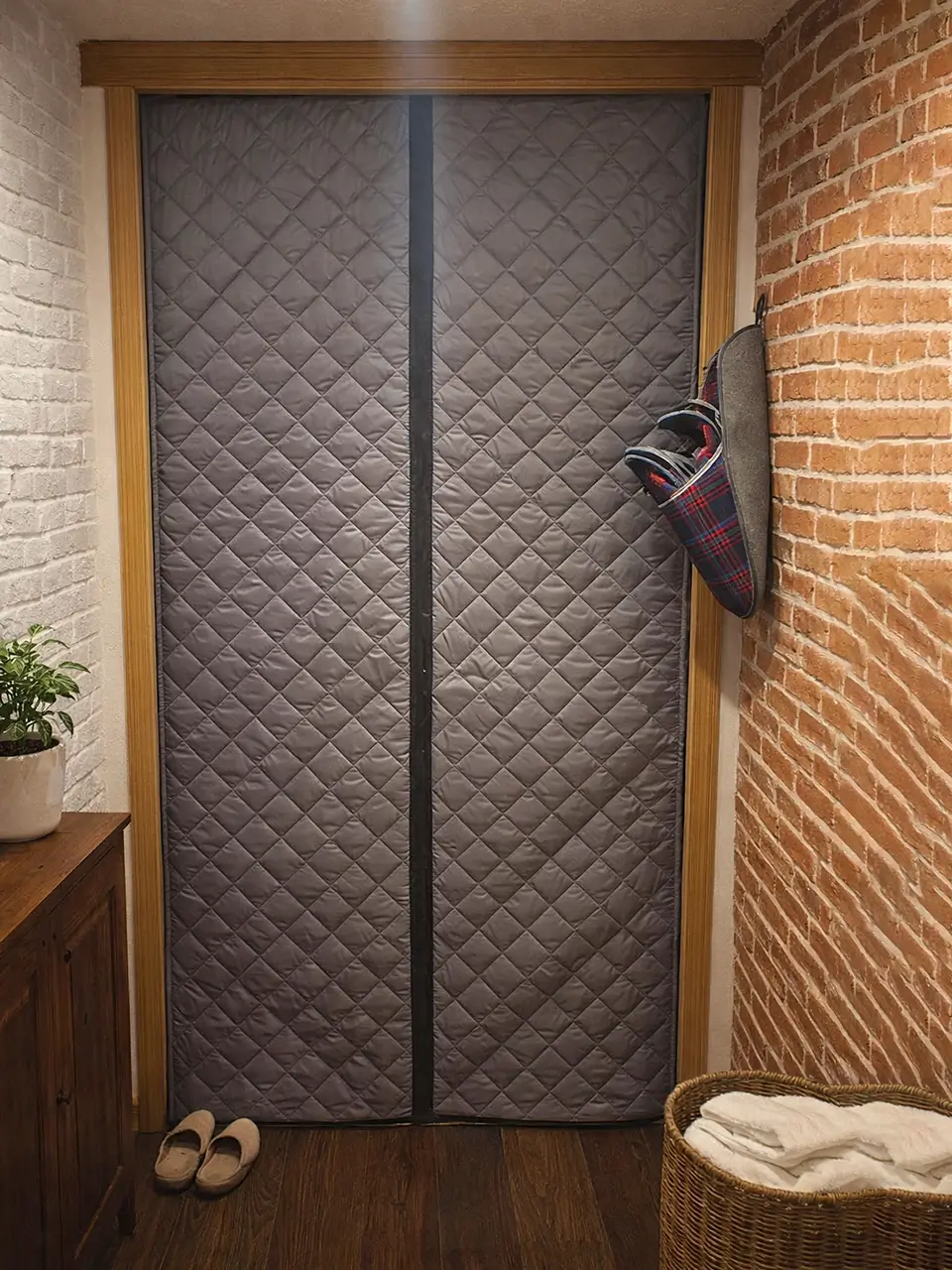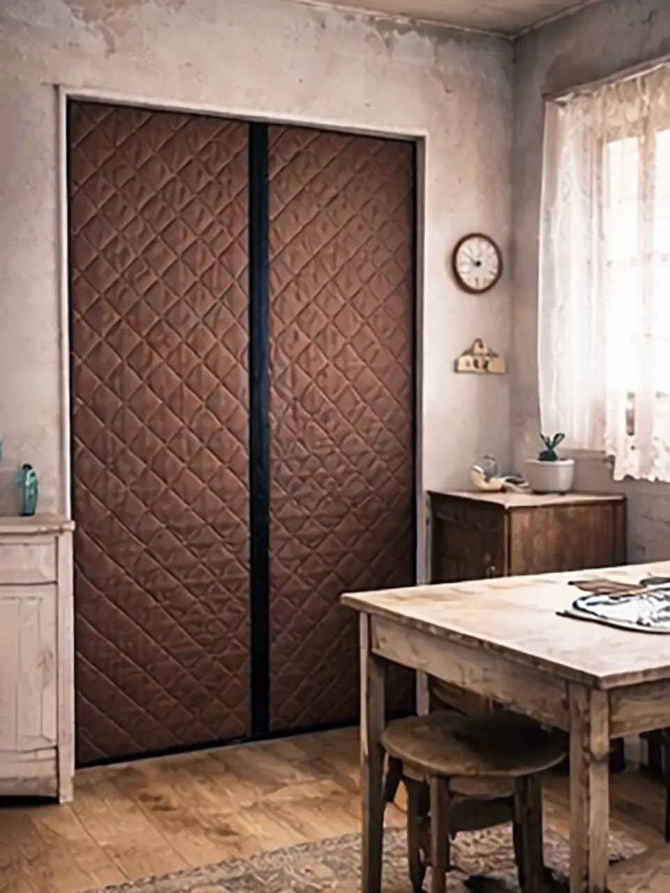 Утеплённая штора открывается и закрывается за счёт мощных магнитов, они хорошо удерживают сквозняк, однако домашним животным и детям пройти сквозь штору будет не сложно. Изнутри и снизу изделие обрамлено износостойкой окантовкой, а по периметру пришита лента-липучка. Её также можно подобрать в цвет шторы или двери.