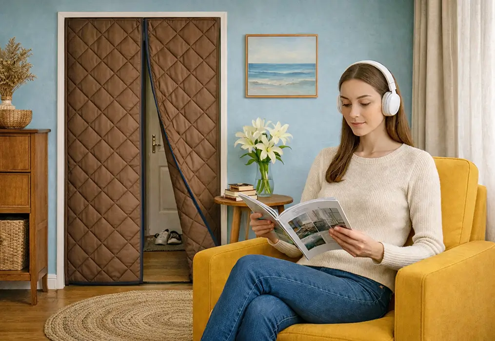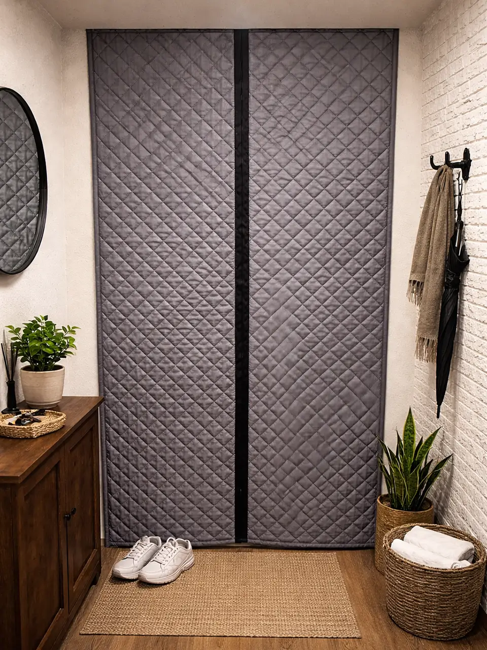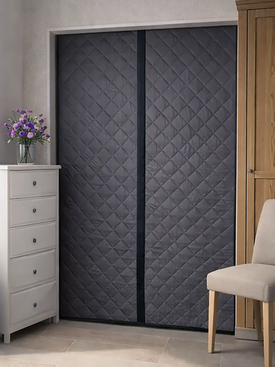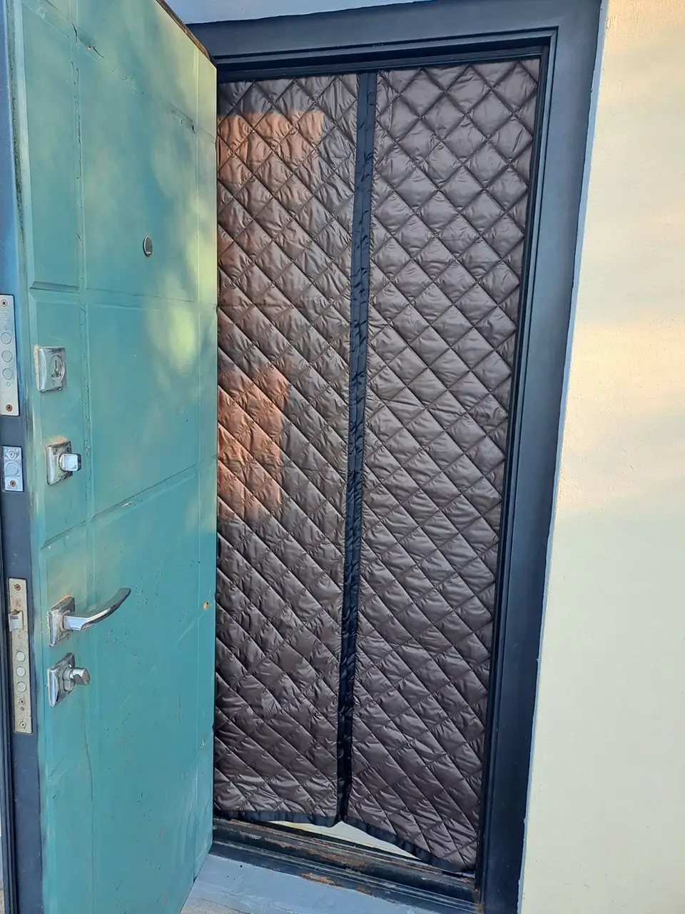 - За счёт плотного полотна магнитной шторки и отсечённого воздуха между ней и дверью автоматически создаётся дополнительный звукобарьер. Дверная или оконная штора глушит звуки с улицы и это не маловажный фактор для любого жилища. Считаю это немаловажный бонус к теплозащите.